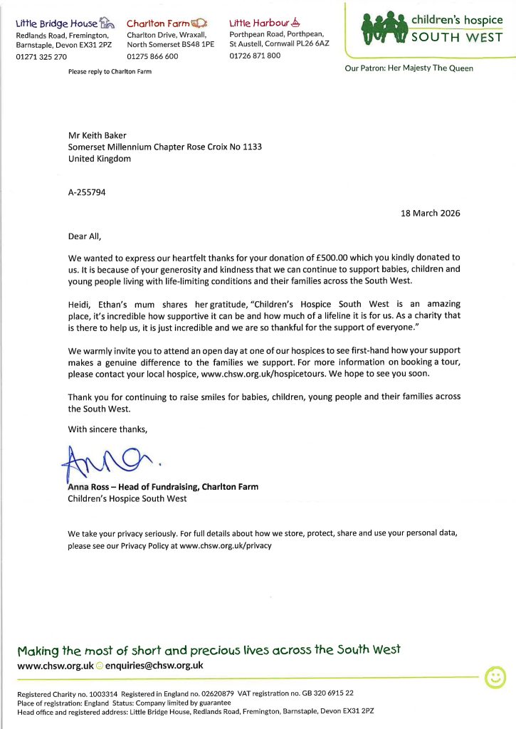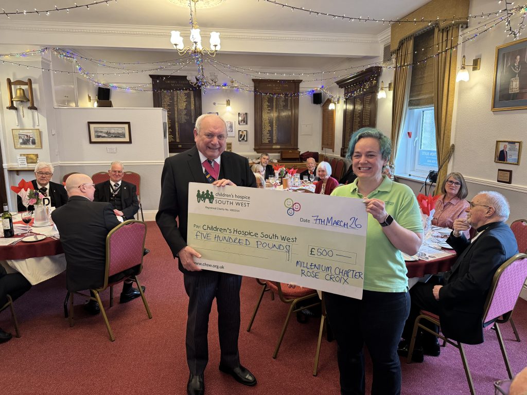 After the short meeting the members and maany of their wives and partners joined together to receive another brief talk from Lucy of the Childrens Hospice South-West, a charity close to may members hearts, particularly Keith Baker, the current MWS of MIllenium and of course the District Recorder. After the Talk (which was thought provoking and left several people reaching for a Tissue) a cheque for £500 was presented to her, followed by a lovely meal prepared by Zena and Neil which was enjoyed by all.